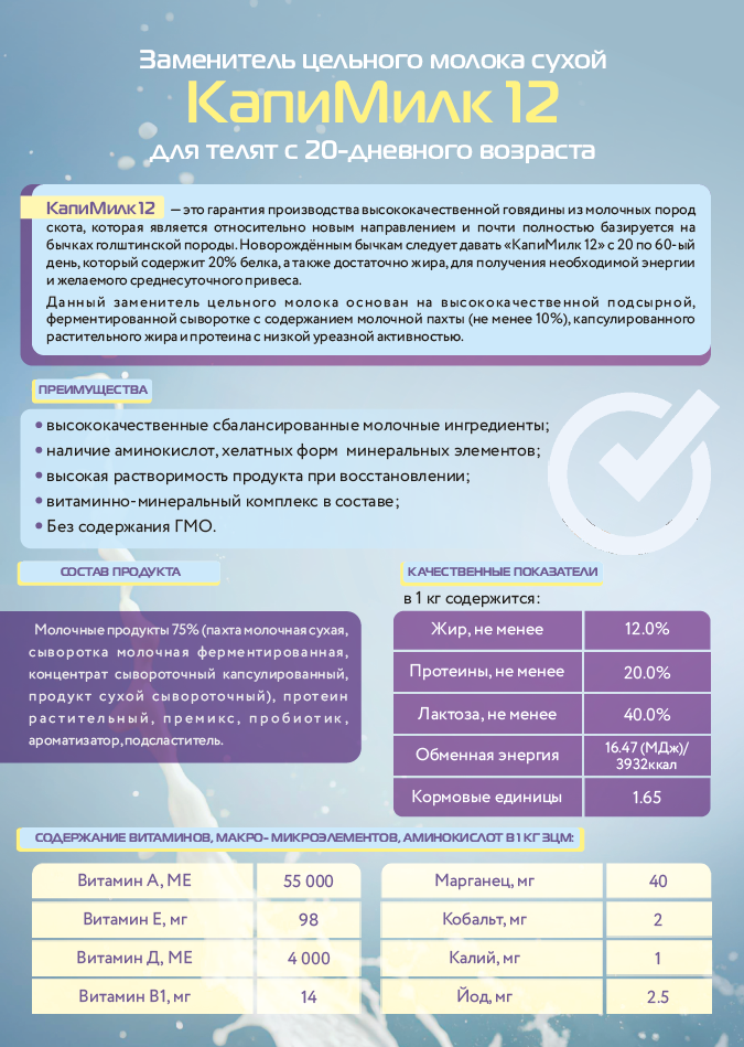 КапиМилк 12 это гарантия производства высококачественной говядины из молочных пород скота, которая является относительно новым направлением и почти полностью базируется на бычках голштинской породы. Новорождённым бычкам следует давать КапиМилк 12 с 20 по 60-ый день, который содержит 20% белка, а также достаточно жира, для получения необходимой энергии и желаемого среднесуточного привеса. Данный заменитель цельного молока основан на высококачественной подсырной, ферментированной сыворотке с содержанием молочной пахты (не менее 10%), капсулированного растительного жира и протеина с низкой уреазной активностью.