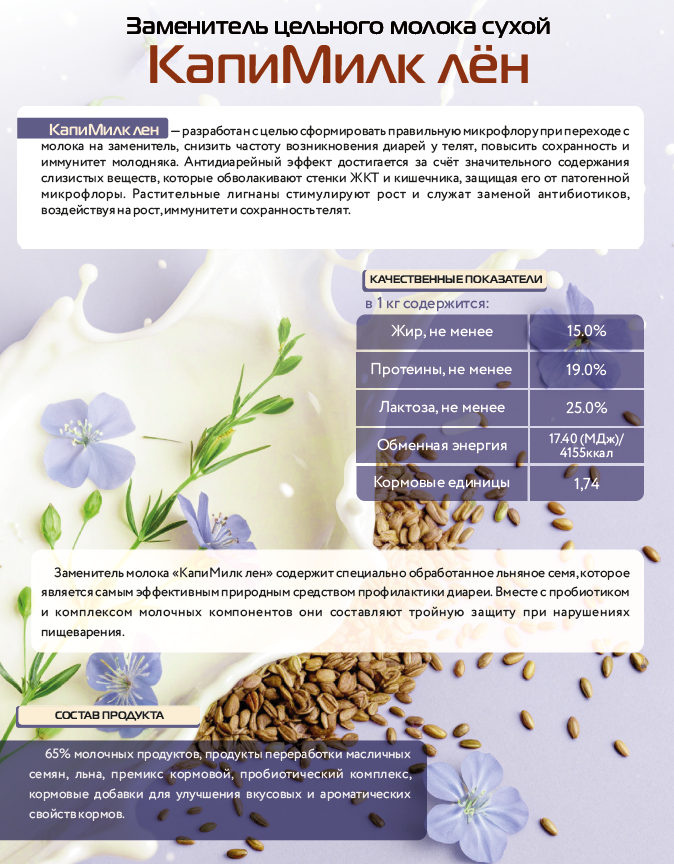 КапиМилк лен разработан с целью сформировать правильную микрофлору при переходе с молока на заменитель, снизить частоту возникновения диарей у телят, повысить сохранность и иммунитет молодняка. Антидиарейный эффект достигается за счёт значительного содержания слизистых веществ, которые обволакивают стенки ЖКТ и кишечника, защищая его от патогенной микрофлоры. Растительные лигнаны стимулируют рост и служат заменой антибиотиков, воздействуя на рост, иммунитет и сохранность телят.