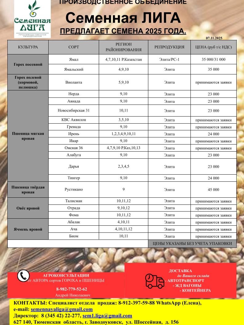 Компания «Семенная Лига» реализует семена оригинальных, элитных и репродукционных культур: